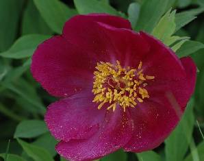 A la différence des pivoines cultivées qui comptent de nombreuses rangées de pétales imbriquées les unes dans les autres, la pivoine sauvage possède de grandes fleurs rouges à une seule rangée de 5 à 8 pétales, avec des étamines jaunes aux stigmates rouges, et de grandes feuilles aux multiples divisions.