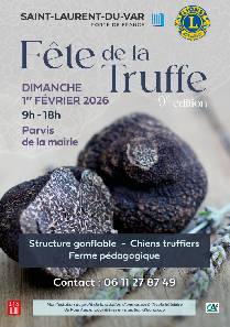 La ville de Saint-Laurent-du-Var et le Lions Club, en partenariat avec le syndicat des trufficulteurs des Alpes-Maritimes, organisent la 9e édition de la Fête de la truffe, le dimanche 1er février 2026, de 9h à 18h, sur le parvis de la mairie.