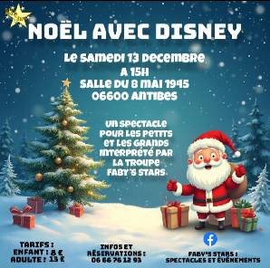 Un spectacle féerique spécialement imaginé pour les enfants, avec l’ambiance magique des fêtes de Noël et l’univers enchanteur de Disney : personnages emblématiques, musiques cultes… et bien sûr la venue du Père Noël, qui distribuera des cadeaux en fin de représentation !