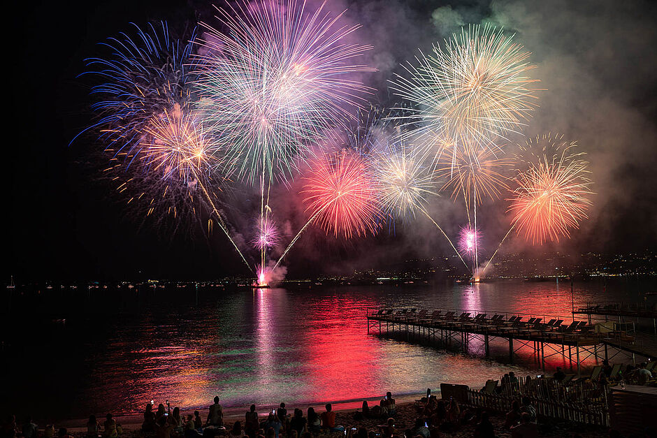 Tir du feu d'artifice à 18h pendant environ 15 minutes en face de la promenade du Soleil, entre la Jetée et le Ruban bleu.