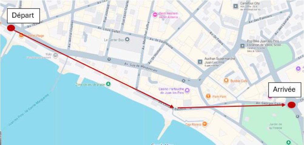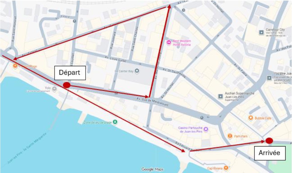 La déambulation se fera sur les trottoirs en passant par l'avenue Guy de Maupassant, l'avenue du Maréchal Joffre, l'avenue de l'Estérel puis direction le square Jacques Leonetti par la promenade du Soleil depuis le rond-point de l'Estérel.